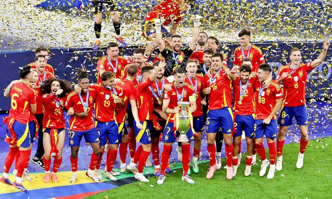 Seleção Espanhola de forma invicta vence o Euro 2024 ao derrotar na final a  seleção da Inglaterra por 2 bolas a 1. A seleção Espanhola com sete jogos sem perder ou empatar no Euro 2024 conquista o seu quarto troféu nos Europeus.